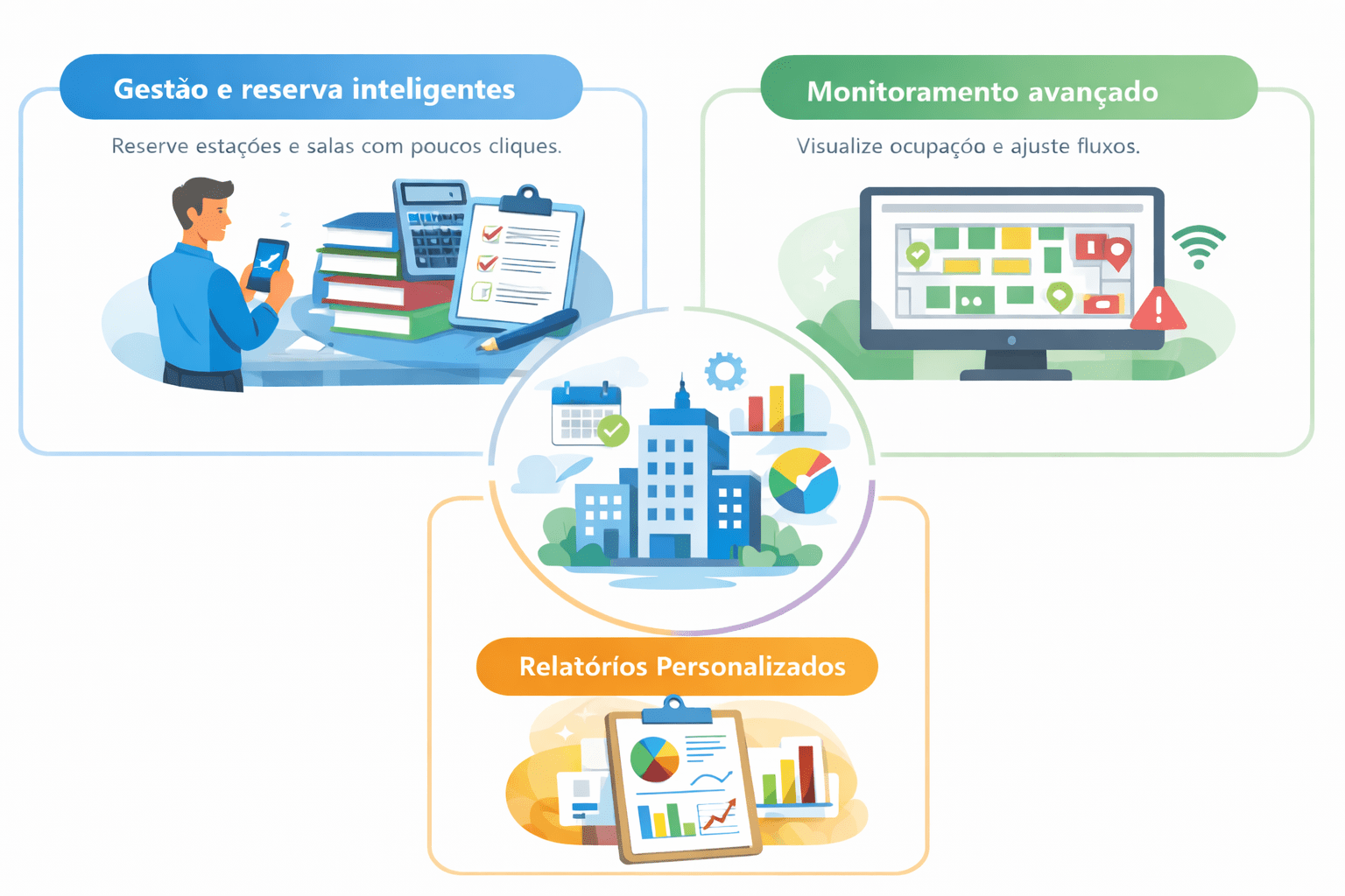 Evoluindo para um conceito de Workplace OS, a solução amplia seu escopo para além dos escritórios, atendendo qualquer espaço que demande gestão inteligente.